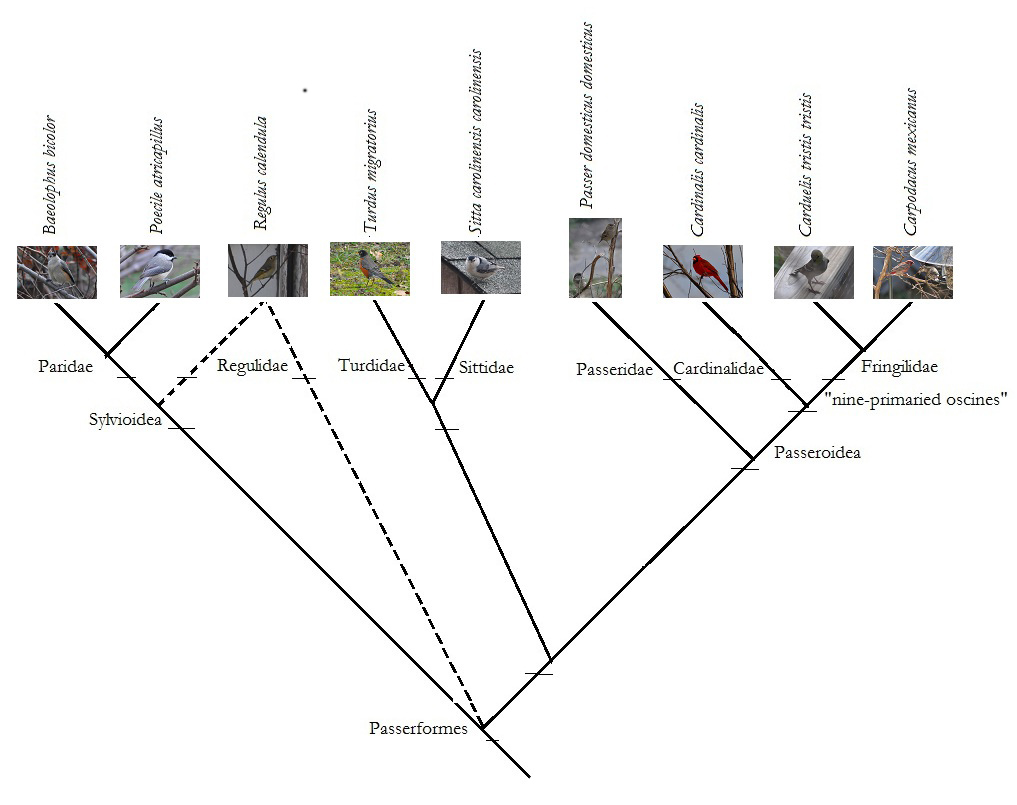 Bird #11 was another tricky one, and was one of the two birds that I had never previously seen in my backyard.  But Susan was able to correctly identify it as a ruby-crowned kinglet, despite the fact that there is no visible indication of the rufous crown in this image.  Perhaps the white wing bars and eye ring gave it away.  But identifying a bird is only half of my objective here.  The other half involves figuring out how it's related to other birds, and this one is tricky.  All kinglets are placed within the genus Regulus in the family Regulidae, situated in the order Passeriformes.  But what is their relationship to other passerines?  That part is not as clear.  Their resemblance to Old World warblers traditionally placed them within Sylvioidea, despite them having their own family status (Monroe, 1992).  And while regulids are more closely related to the sylvioid superfamily (and the passeroid, certhioid, and muscicapoid superfamilies), than to others within Passerida, they cannot be directly linked to any one superfamily given the current data (Harshman, 2008).  That being said, their place on our growing cladogram is not as certain as the other birds we've seen so far.  Regulidae either lies within Sylvioidea as a sister group to the Paridae, or is part of a soft polytomy with Sylvioidea and the "Turdidae + Sittidae + Passeroidea" clade.  This uncertain relationship is indicated by the dashed lines, representing both of the potential phylogenies.